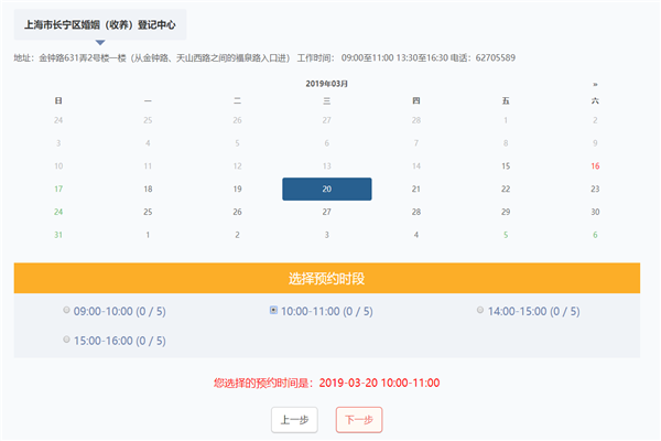 (5)确定预约日期及时段,数字颜色代表不同状态:红色表示已约,满绿色表示非工作日,黑色表示可预约。