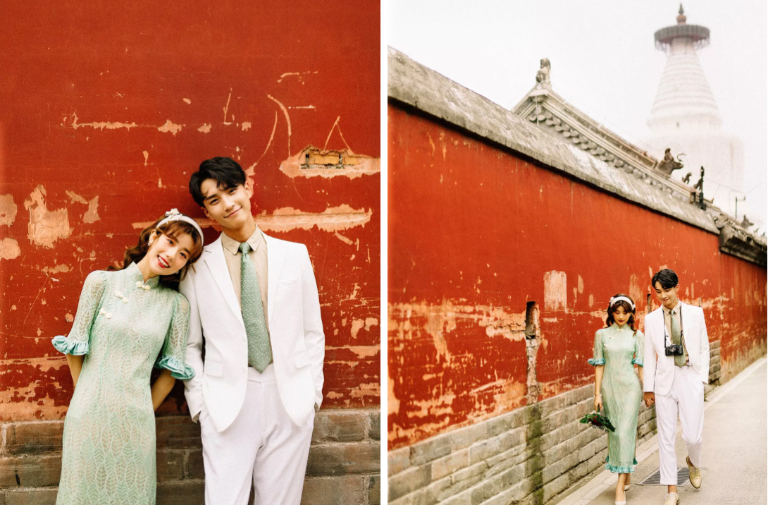 中式本身就是有一种怀旧的情怀,红墙背景和西装婚纱,能将红色与白色完美融合,演绎出高级感满满的浪漫故事。中式风格的多样化与现代化极简的融合,这种质感的婚纱照,锁住婚礼中的纪实故事感,又多出一些浪漫情怀,是当下很多新人拍胡同婚纱照必选。