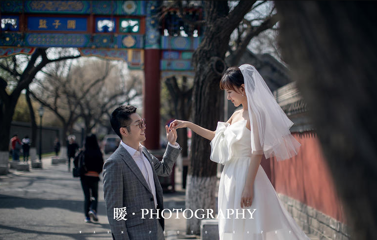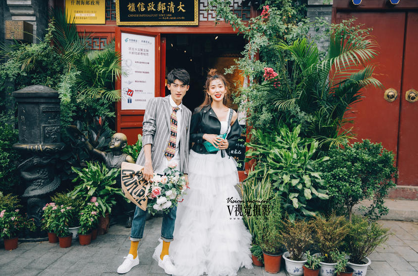 烟袋斜街在什刹海的核心区内,这里有不少古老的胡同和四合院,具有浓郁的老北京特色,也吸引了很多电视剧在此取景拍摄。烟袋斜街里的灰墙土瓦、红门青砖与洁白的婚纱,碰撞出时尚与市井的艺术感,婚纱照显得极为别致。